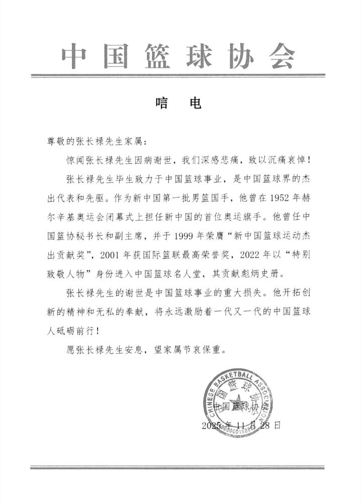 中国篮协官方表示:沉痛悼念中国篮球名宿张长禄先生。