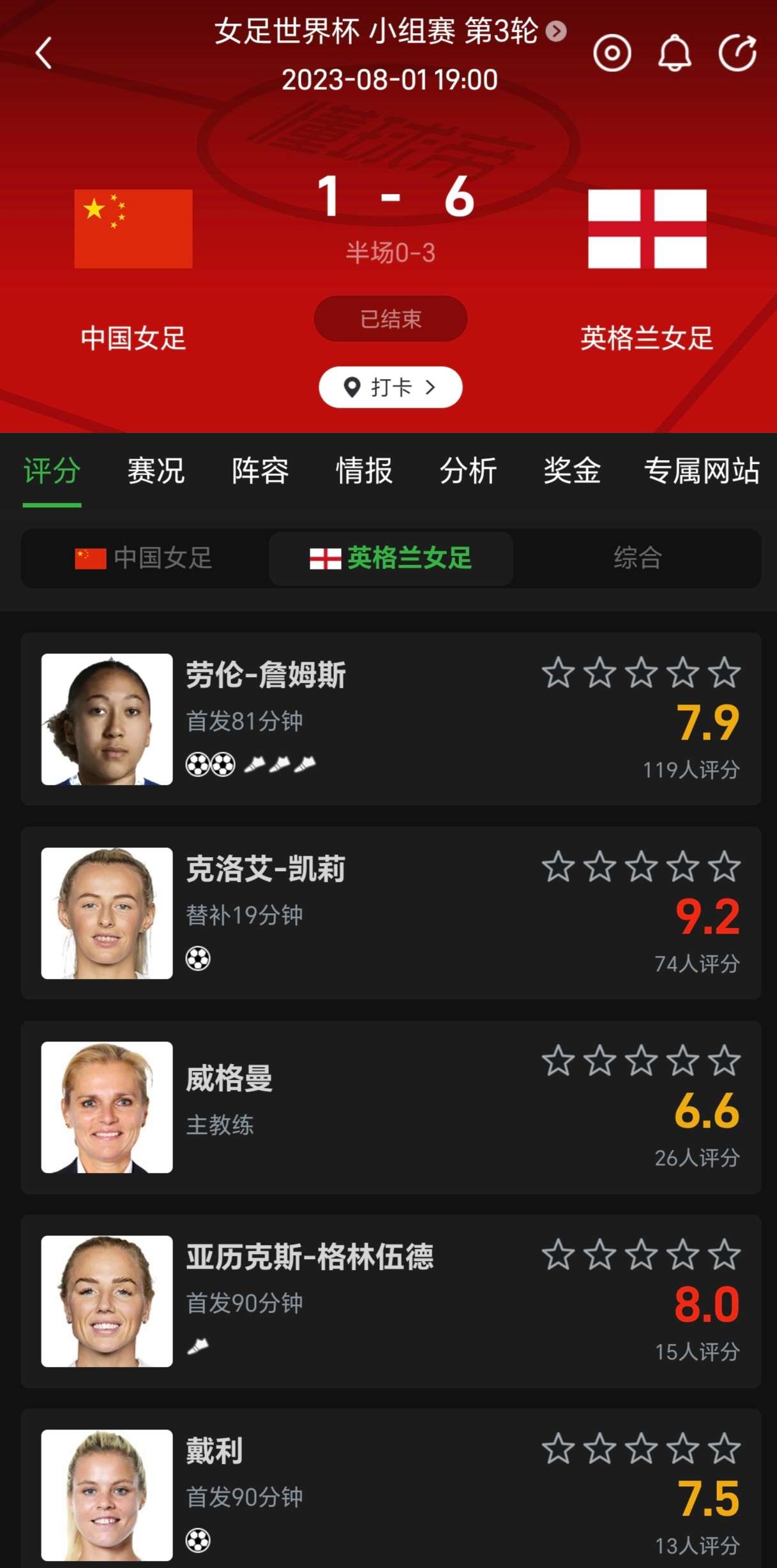 目前中国女足排名世界第16位,英格兰女足排名世界第4位。