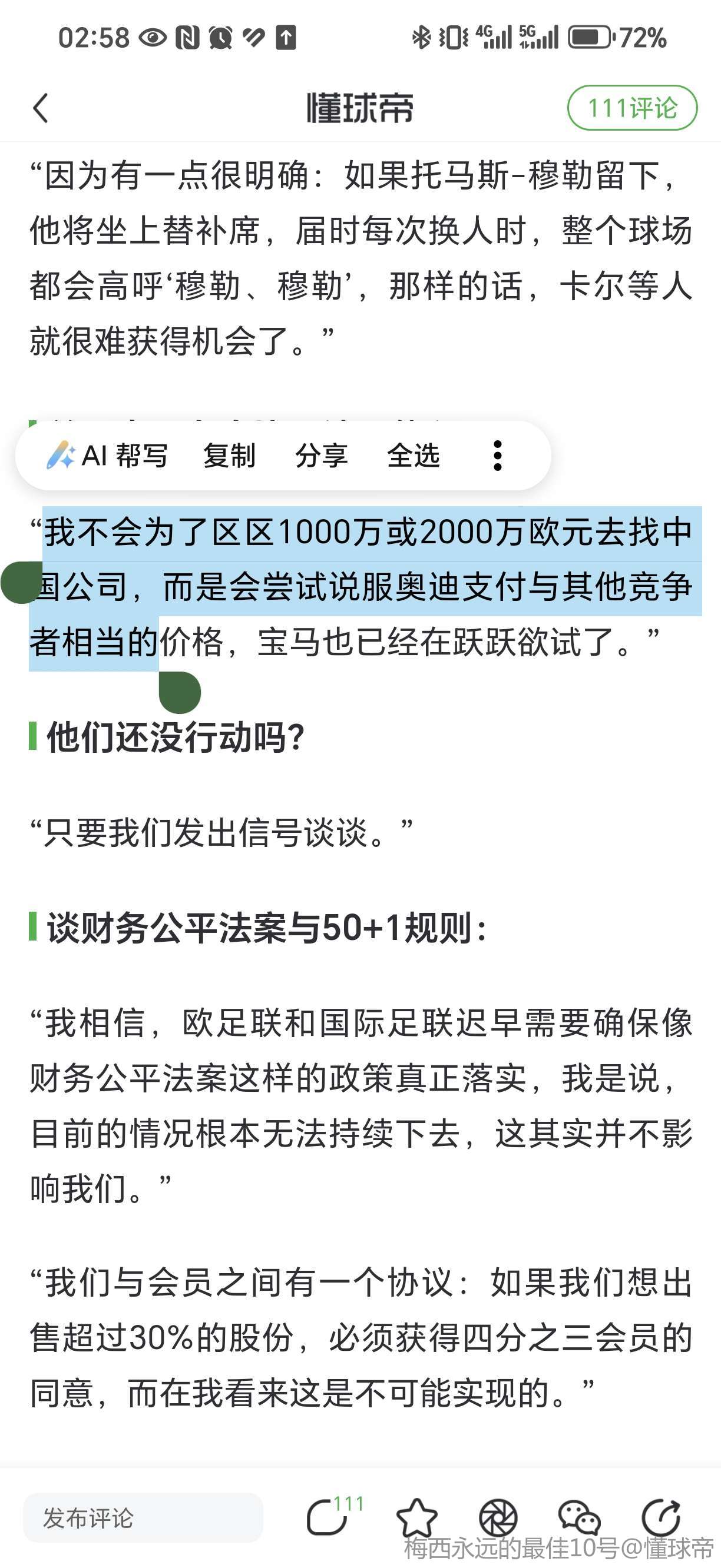 “我相信,欧足联和国际足联迟早需要确保像财务公平法案这样的政策真正落实,我是说,目前的情况根本无法持续下去,这其实并不影响我们。”