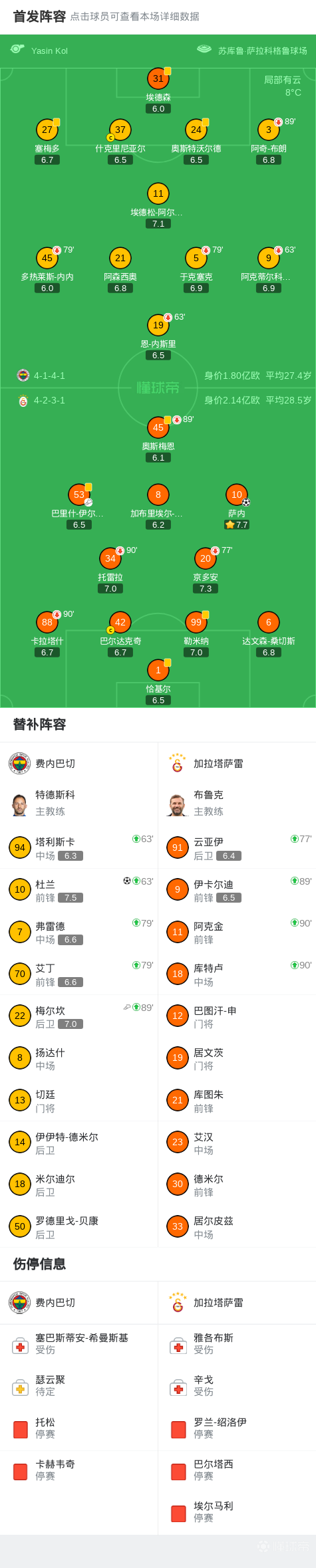 半场战报:费内巴切0-1加拉塔萨雷,萨内建功