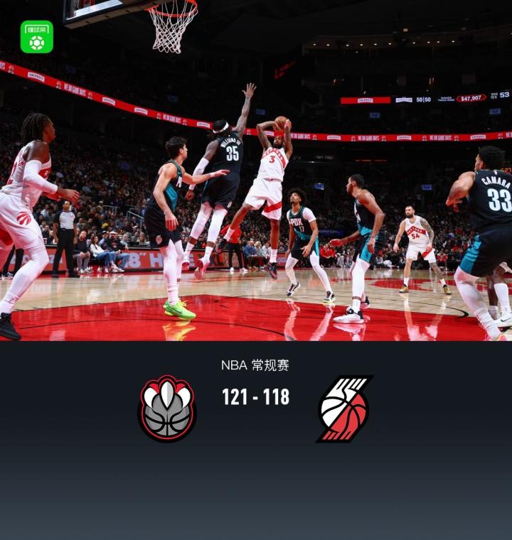 第四节,开节开拓者克林根二次进攻2+1得分,随后阿夫迪亚与巴恩斯、迪克展开对飚,猛龙依旧领先14分,随后猛龙进攻断电,开拓者卡马拉、阿夫迪亚相继三分,紧跟格兰特、阿夫迪亚冲框,一波10-0追至4分分差,猛龙巴恩斯、英格拉姆站出来得分止血稳住局面,开拓者夏普站出来持续冲框得分迫近至2分分差,随后猛龙奎克利、珀尔特尔相继得分再度拉开分差,开拓者卡马拉、阿夫迪亚、夏普回应再度迫近至2分,最后关键时刻开拓者阿夫迪亚接连强攻未果,猛龙英格拉姆连得3分领先5分,开拓者格兰特强行三分续命,猛龙英格拉姆两罚一中领先3分,但时间还剩1秒开拓者阿夫迪亚后场三分不中,全场结束,猛龙121-118战胜开拓者。