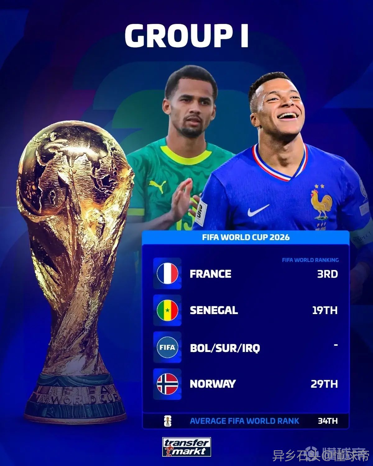 法国 (3)、塞内加尔 (19)、玻利维亚/苏里南/伊拉克 (待确定)、挪威 (29),平均排名:第34名。