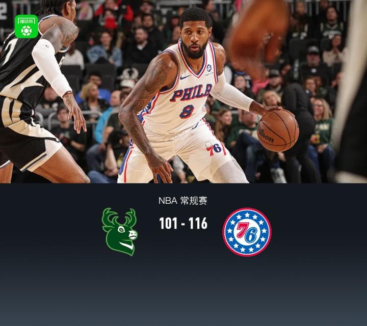 扫描下载懂球帝首页>动态> 76人116-101轻取雄鹿,乔治20+5+5,波特20+7+9