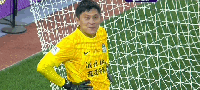 第90+3分钟,点球被要求重罚后,扑点成功的王国明尴尬的微笑
