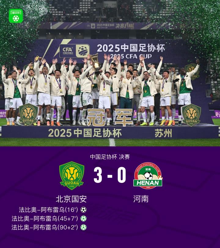 北京时间12月6日中国足协杯决赛,北京国安对阵河南。上半场,法比奥乱战中率先得分,随后在补时阶段点射完成梅开二度,下半场补时阶段,法比奥点射再次得分完成帽子戏法。最终比分北京国安3-0河南第5次夺得足协杯冠军。