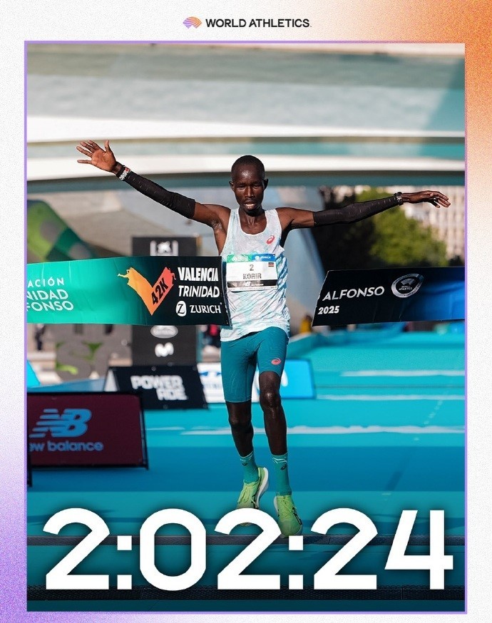 12月7日,2025瓦伦西亚马拉松,肯尼亚选手约翰-科里尔2:02:24完赛,获得男子组冠军,日本选手大迫杰2:04:55完赛,刷新国家纪录的同时也创造了全新的亚洲纪录。