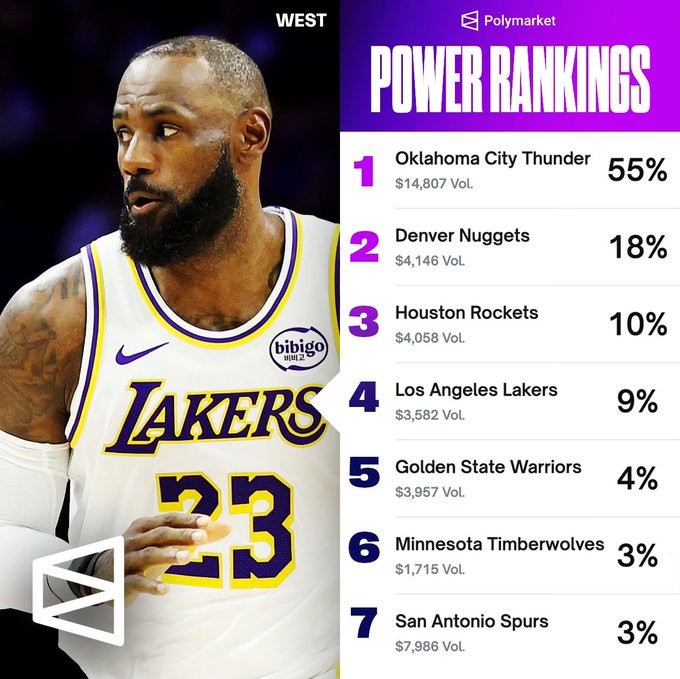 扫描下载懂球帝首页>动态> 西部各队进总决赛热门排行:雷霆上涨17%到55%,湖人9%排第四