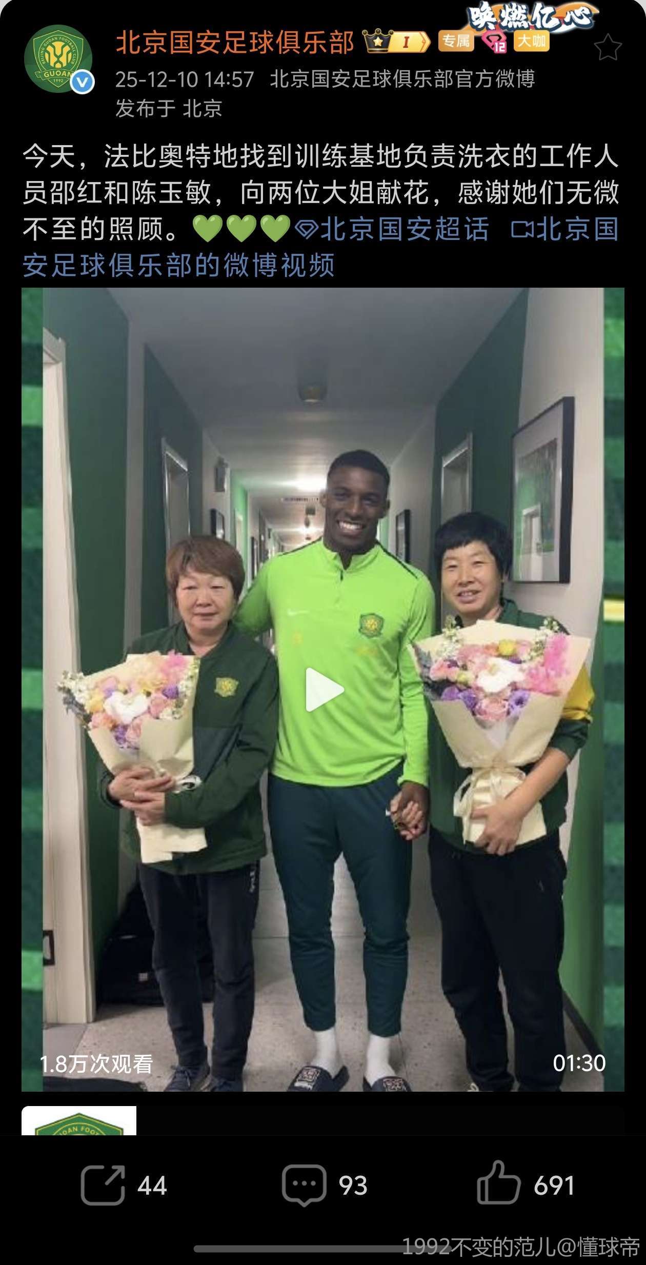 12-09 17:26感谢背后的付出,法比奥向国安基地负责洗衣的两位大姐献花