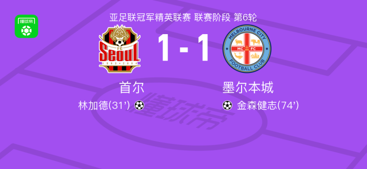 北京时间12月10日,亚足联冠军精英联赛联赛阶段第6轮,首尔与墨尔本城展开对决。比赛中,崔浚送出精准助攻,林加德接球后冷静施射破门,为首尔先拔头筹。随后,拉赫马尼在进攻中创造机会,金森健志把握时机完成破门,帮助墨尔本城扳平比分。双方均未能再度改写比分,最终以1比1握手言和。
