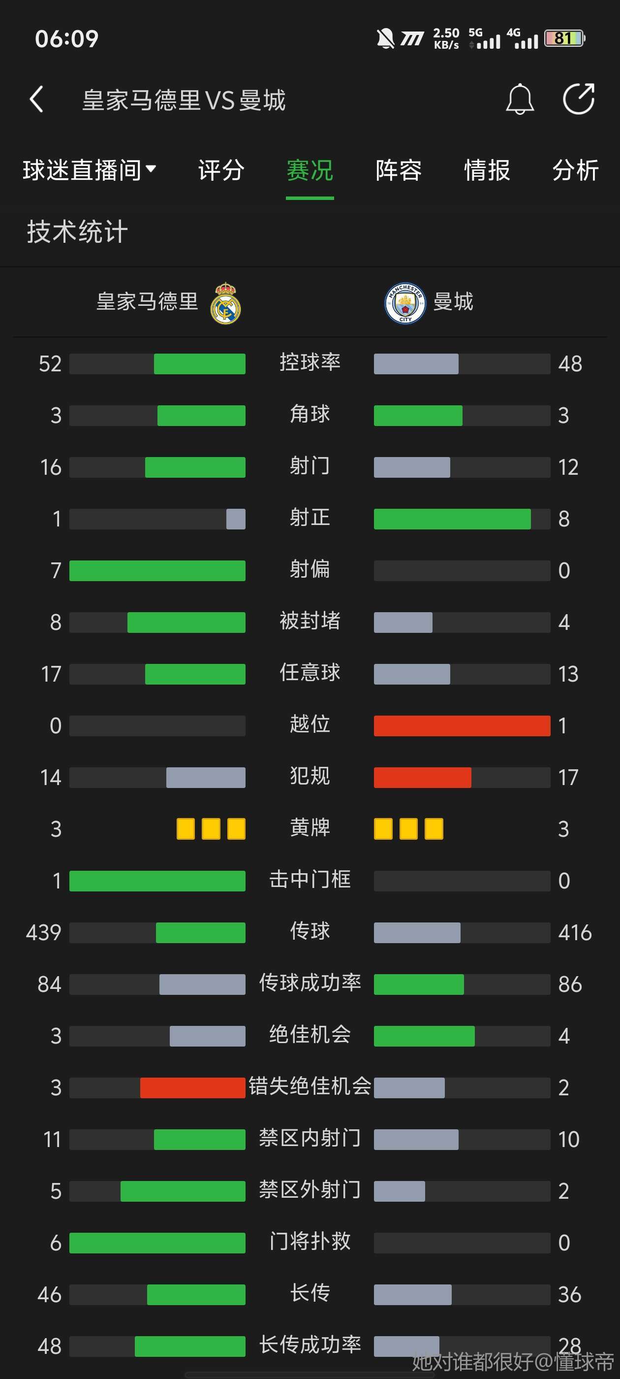 皇马这场终于踢出了久违的进攻套路,进球差点运气。这场输了能接受,后防线的伤缺和吕迪格的暴雷,造就了比赛结果。