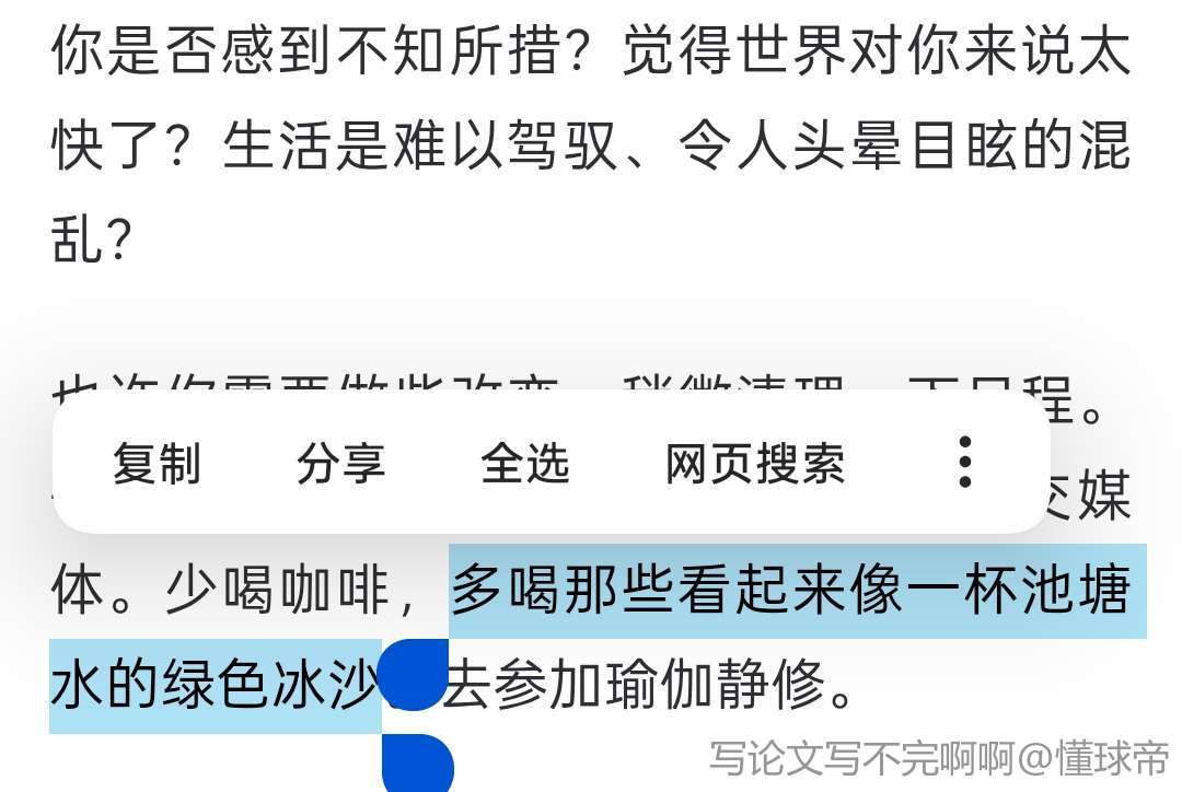 也许你需要做些改变。稍微清理一下日程。每晚九点把手机锁进抽屉。别再刷社交媒体。少喝咖啡,多喝那些看起来像一杯池塘水的绿色冰沙。去参加瑜伽静修。