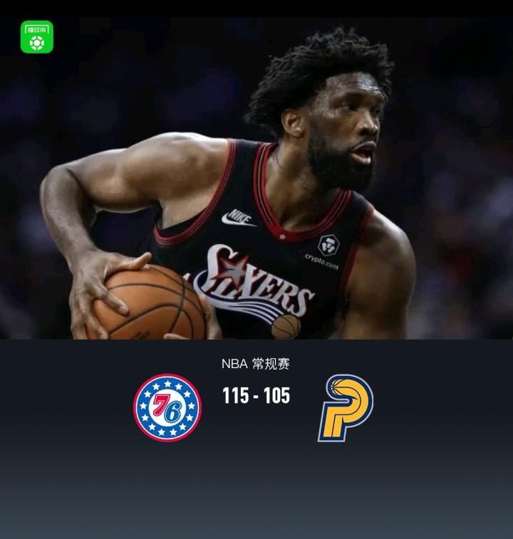 第四节,开节段双方替补阶段进攻持续打铁,步行者抓住机会领先5分,后半节上来76人依靠造杀伤罚球追平比分,比赛来到最后4分钟,步行者进攻哑火,76人乔治、恩比德联手一波15-3收下比赛,最终76人115-105战胜步行者。