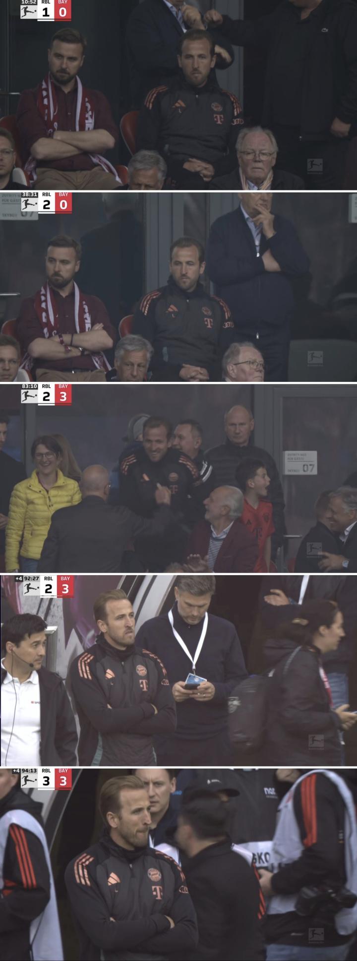 当比赛进入伤停补时阶段的时候,凯恩明显已经迫不及待,直接走到了场边等待着主裁判吹响终场哨。然而莱比锡在最后时刻攻入了读秒绝平的进球,于是转播镜头再次找到凯恩,此时的凯恩表情显得极为复杂。