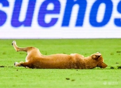 【哥甲球员受伤后倒地翻滚,一小狗跑上场完美模仿他摔倒的动作】