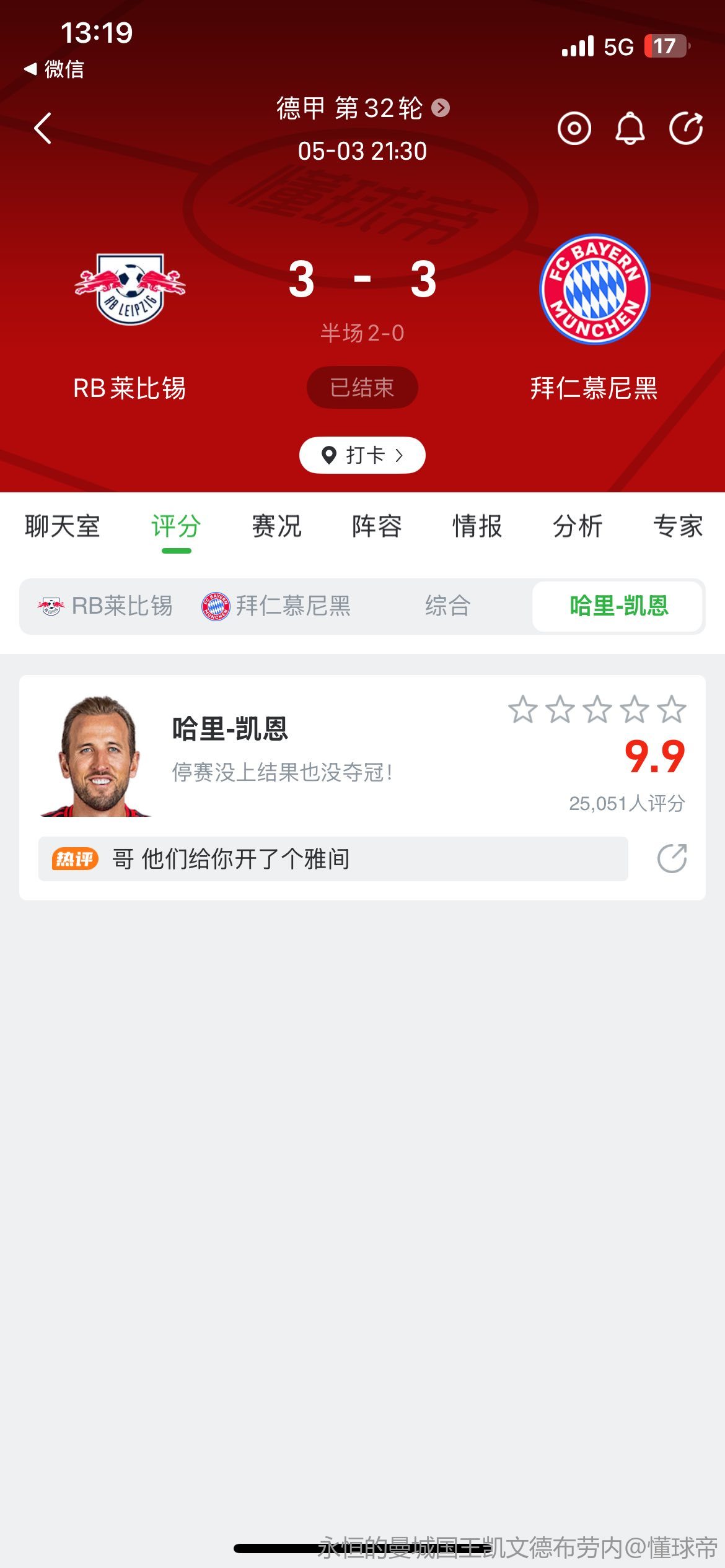 上赛季德甲第32轮,拜仁慕尼黑在客场遭遇补时绝平3-3战平莱比锡,无缘提前两轮夺冠。本场凯恩因累积黄牌无缘出战,转播镜头多次给到看台上的凯恩。
