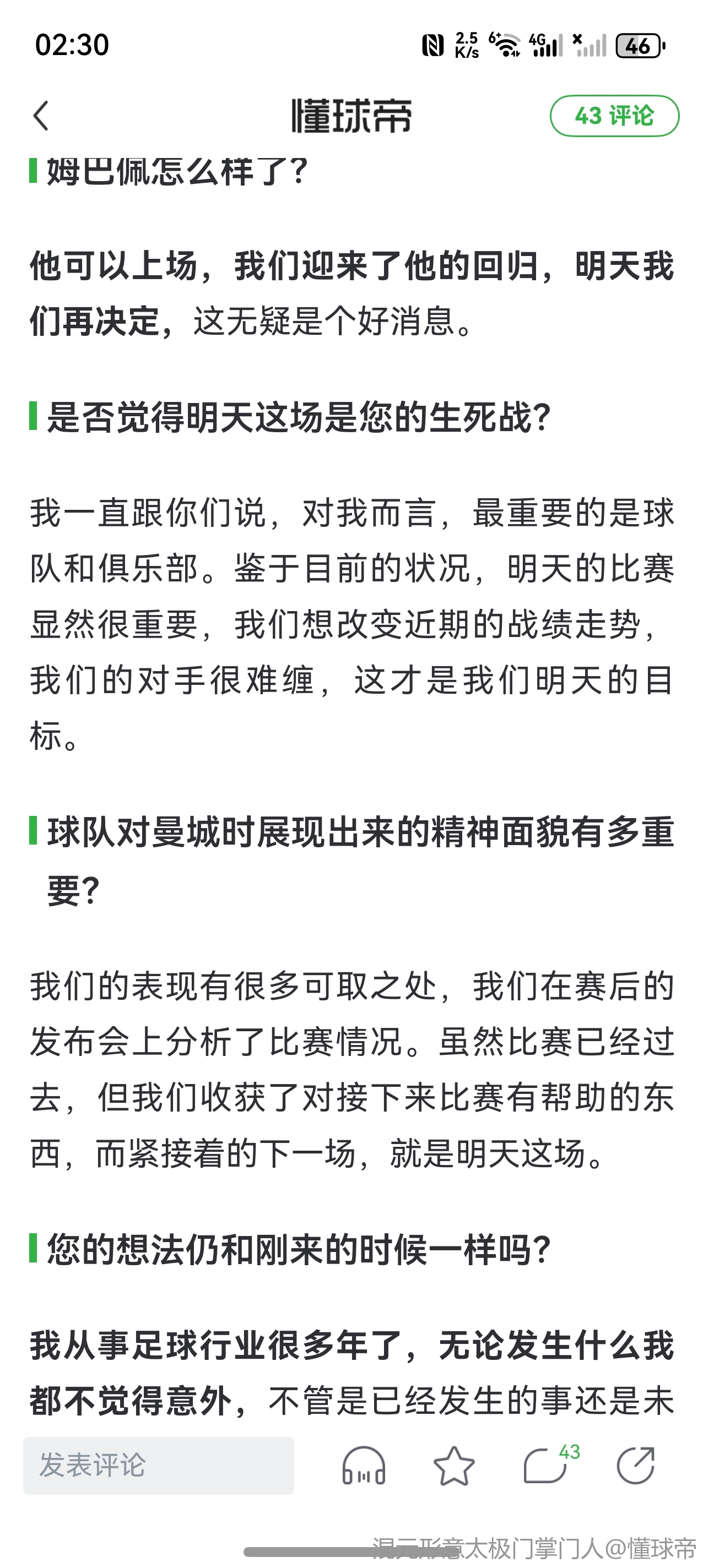 我一直跟你们说,对我而言,最重要的是球队和俱乐部。鉴于目前的状况,明天的比赛显然很重要,我们想改变近期的战绩走势,我们的对手很难缠,这才是我们明天的目标。