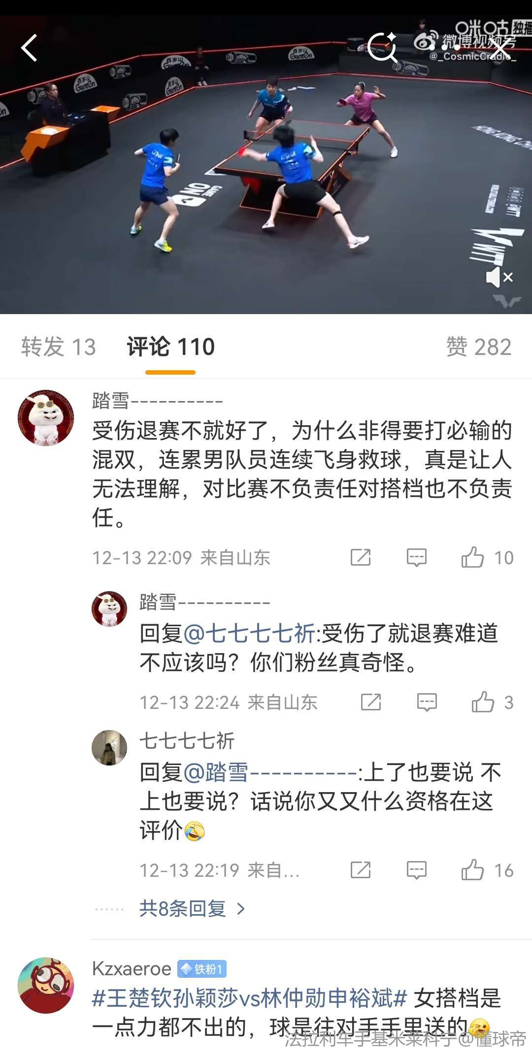 北京时间12月13日,WTT香港总决赛混双决赛,王楚钦/孙颖莎0-3不敌林仲勋/申裕斌获得亚军。赛后,孙颖莎谈到了自己的脚伤。