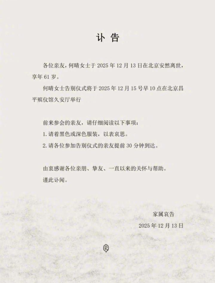 12月13日,著名演员何晴家属发布讣告显示,何晴在北京安然离世,享年61岁。告别仪式将于2025年12月15号早10点在北京昌平殡仪馆久安厅举行。