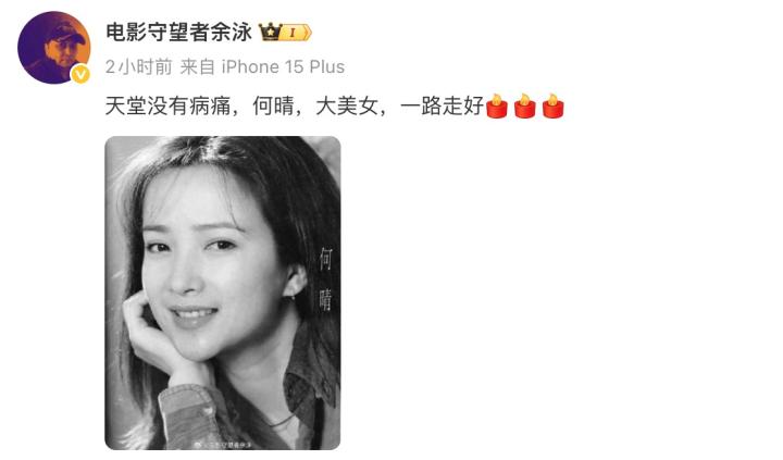 “电影守望者余泳”向扬子晚报记者证实了这一消息,他于社交平台发布何晴的黑白肖像照,并配文“天堂没有病痛,何晴,大美女,一路走好”,引发网友与演艺圈人士的集体缅怀。余泳透露,何晴生病后一直希望低调,让大家永远记住她美好的形象。