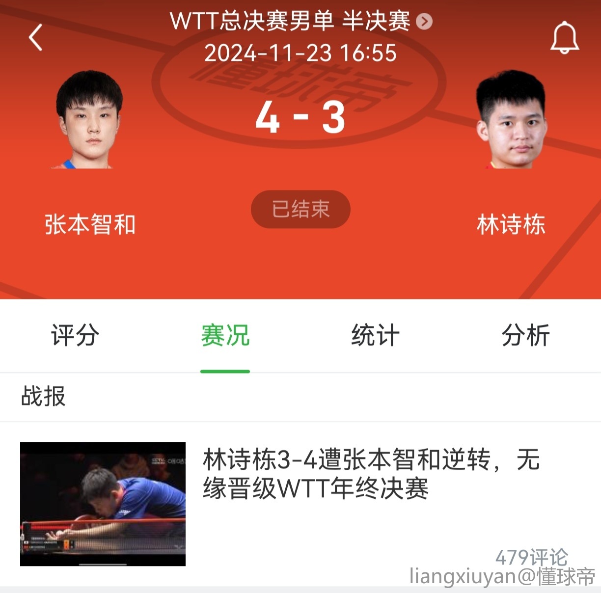 扫描下载懂球帝首页>动态> 林诗栋3-4不敌张本智和,无缘香港总决赛男单决赛
