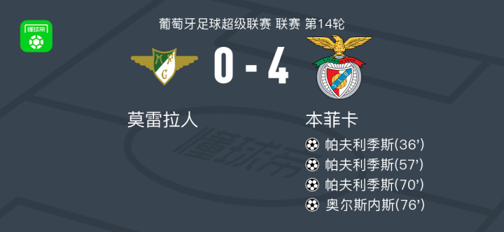 扫描下载懂球帝首页>动态> 本菲卡4-0大胜莫雷拉人,帕夫利季斯帽子戏法,奥尔斯内斯1射2传