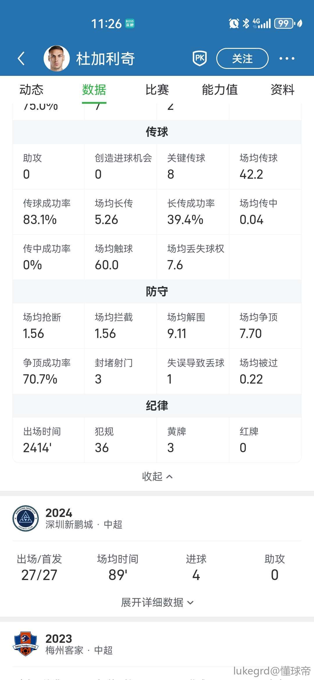 数据方面,在深圳新鹏城队效力期间,杜加利奇共出战过56场比赛,贡献8粒进球。