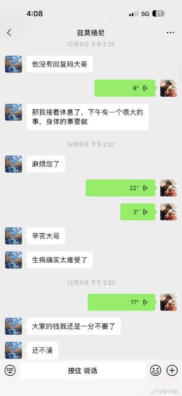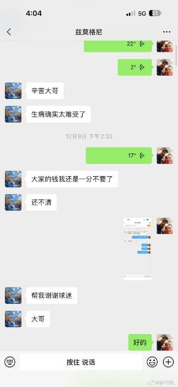 北京时间12月16日,媒体人李平康晒出多张微信聊天截图并表示,被戴琳欠钱的球迷潘硕在昏迷前的最后时刻惦记的最后一件事是戴琳有没有联系自己,并感谢了一直关注他的球迷,表示不想大家捐钱。