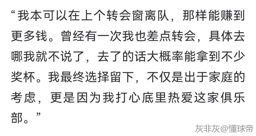 “我本可以在上个转会窗离队,那样能赚到更多钱。曾经有一次我也差点转会,具体去哪我就不说了,去了的话大概率能拿到不少奖杯。我最终选择留下,不仅是出于家庭的考虑,更是因为我打心底里热爱这家俱乐部。”