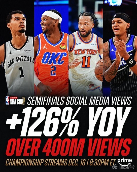 扫描下载懂球帝首页>动态> NBA杯半决赛社媒观看量同比增长126%,所有平台累计观看量超4亿次