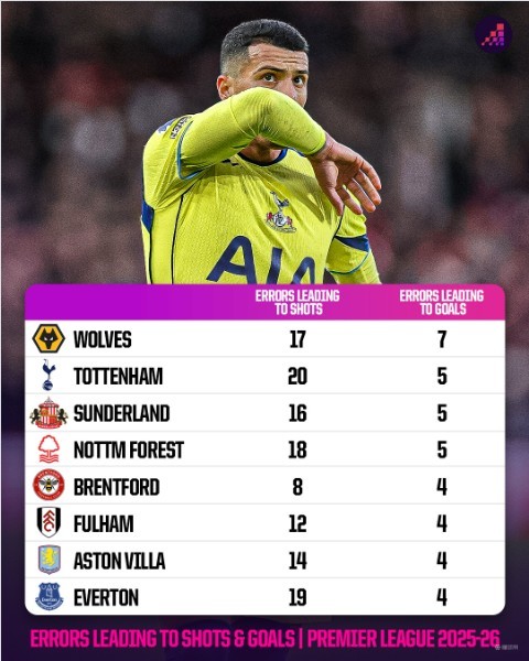 扫描下载懂球帝首页>动态> 本赛季英超失误导致丢球榜:狼队7球居首,热刺等球队5球第二