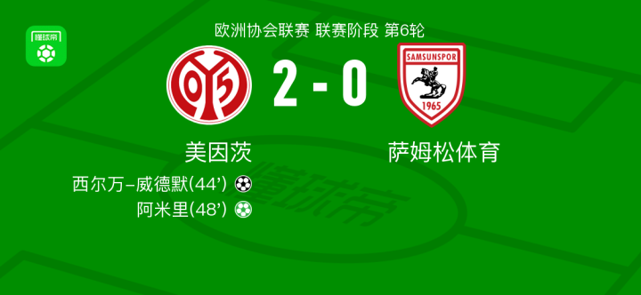 北京时间12月19日欧洲协会联赛 联赛阶段 第6轮,美因茨对阵萨姆松体育。美因茨西尔万-威德默破门,阿米里破门。最终比分美因茨 2-0 萨姆松体育。
