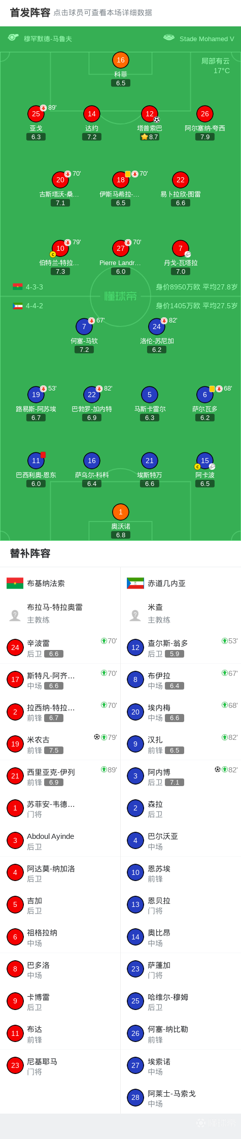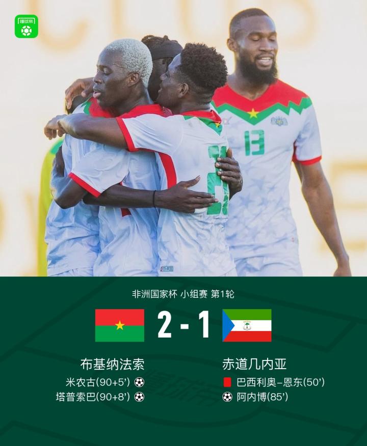 北京时间12月24日非洲国家杯 小组赛 第1轮,布基纳法索对阵赤道几内亚。赤道几内亚队恩东吃到红牌,第85分钟,少一人作战的赤道几内亚由阿内博首开记录。第95分钟和第98分钟,米农古破门扳平,塔普索巴绝杀。最终,布基纳法索2-1逆转绝杀赤道几内亚。