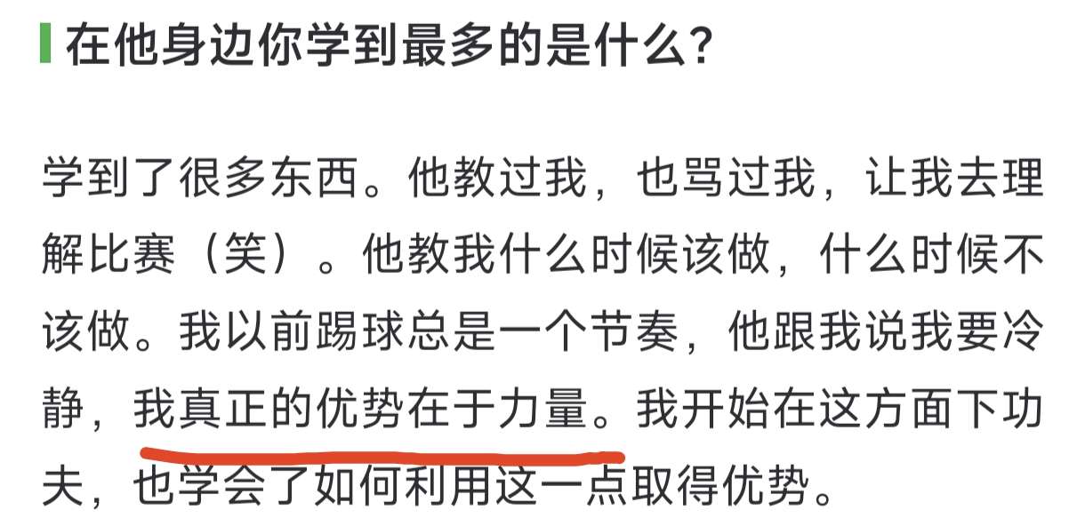 学到了很多东西。他教过我,也骂过我,让我去理解比赛(笑)。他教我什么时候该做,什么时候不该做。我以前踢球总是一个节奏,他跟我说我要冷静,我真正的优势在于力量。我开始在这方面下功夫,也学会了如何利用这一点取得优势。