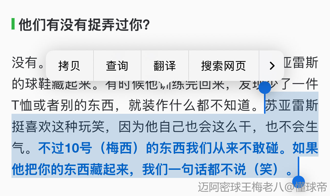 没有。但我和托马斯-阿维莱斯、韦甘特会把苏亚雷斯的球鞋藏起来。有时候他训练完回来,发现少了一件T恤或者别的东西,就装作什么都不知道。苏亚雷斯挺喜欢这种玩笑,因为他自己也会这么干,也不会生气。不过10号(梅西)的东西我们从来不敢碰。如果他把你的东西藏起来,我们一句话都不说(笑)。