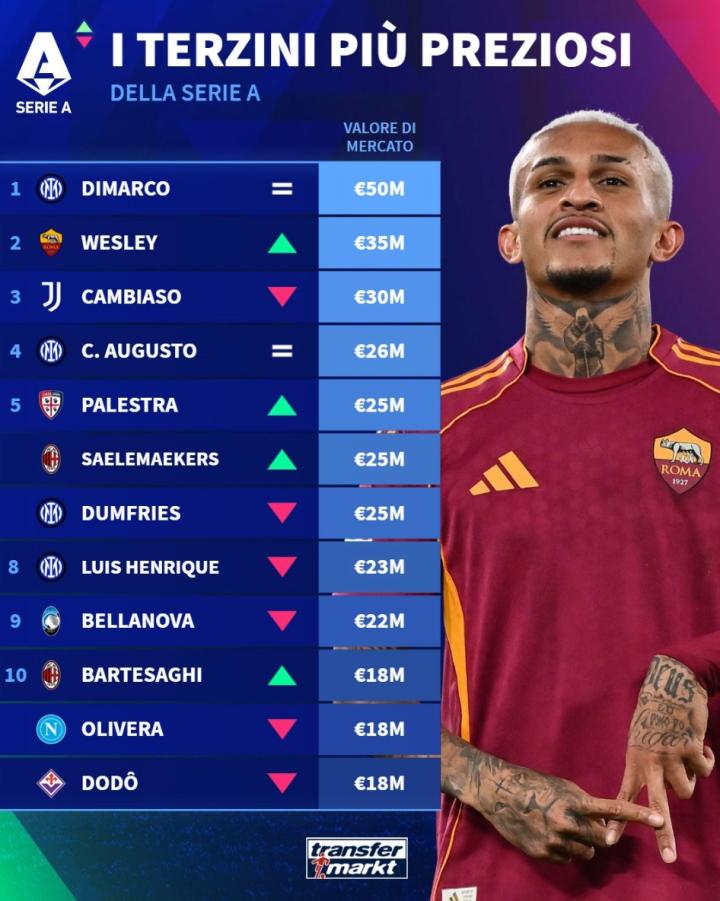 扫描下载懂球帝首页>动态> 德转列意甲边后卫身价前10:国米4人上榜,迪马尔科5000万第1