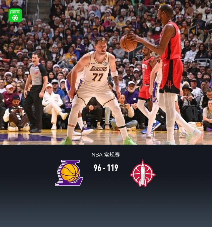 扫描下载懂球帝首页>动态> 圣诞大战湖人96-119惨败火箭,东契奇25+7,詹姆斯18分,杜兰特25+9