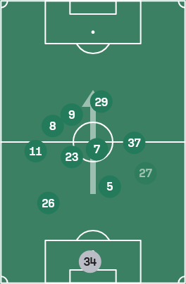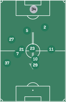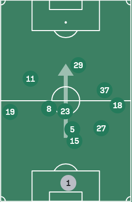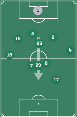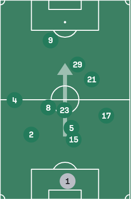 根据上述讨论,我们不难发现一个问题:后场31和32结构都无法完成在中路向前的短传传导,即使球能够给到中场脚下,也几乎会无一例外地导向传给边路,例如拉米罗在带队初期也尝试过复现3412的体系,但最终也只是导向了边前卫起球传中找中锋的比赛模式。这并不是说边前卫传中有错,这其实反而是拉米罗对国安现有阵容特点正确的判断,但侧面证明了这种结构很难把球持续稳定送到两线间,难以在纵向上稳定联系到中锋,还是会过度依赖边前卫持球内切把球直接送到中路这条传球线路,这种不持续的非扇面进攻也是非常容易发生球权转换的进攻模式(考虑到两侧不均衡的接球方向,例如缺少左脚前锋第一步一定要向内侧领,例如右路缺少一个能够带球从边路切入中路的球员)。同时,从塞蒂恩到拉米罗,始终没有解决三中卫高站位在防守时的后场训练问题,这尤其体现在有攻转守阶段,三中卫顶出和退防的统一性,后场球员受限于能力和意识上的问题,经常会被一个小快灵型的反击点冲到痛点。三中卫最直观的一个问题,就是难以平衡攻守两端的平衡,将球一层一层传导渗透打到相对高的位置,但往往因为球员能力上的局限性,或是传跑训练中的问题,也包括中路人数没有在区域内陷入劣势,起球回收二点的布置也不坚决,在进攻三区的肋部和中路掉球,球权转换直接被绕外侧长传打中后卫第一时间很难覆盖到的边路位置,被小个边锋持球小打大,对方源源不断地给到至少两到三人的向前跑位支援,导致国安可能花费了一两分钟耐心持续的传导组织打出的纵深被一两个人压回了后场,导致阵型集体要回撤回防,如此一来,整个后场的消耗被拉得很高,两边的体能消耗自然不对等。达万被用作靠后的那名后腰,古加缺少单对单持球转身的能力,中场就需要第三个人去解套。这个人可以是锋线上的回接,可以是前腰位置上的人选,也可以是后场边后卫的内收,于是,由此国安在赛季中往三个不同方向都有过体系优化:回接-中锋-张玉宁、前腰-塞尔吉尼奥、边后卫内收-乃比江/何宇鹏,但无一例外地,都导向了地面传导效率低的结果。这个结果其实是可以预见的,也是塞蒂恩下课的直接原因:想维持地面的传导进攻,保证传控的效率,就必须要有能创造球路和能回收球权的人同时存在。前者,创造球路,必须满足能传球和能接球,中卫上即使补充了吴少聪,恩加德乌也只是一个破坏点,他的技术不能满足稳定参与压迫下后场短传出球,尤其是要耗费大量体能在防守时,这就能直接对应上我们前面讲的,拉一个边后卫回来打三个半也不现实。后者,要能回收球权,在边路起球或是想肋部传球带球迫使对手解围时,后腰要有极强的移动破坏能力,古加并非强力的对抗型球员,他主要要做的是双后腰之中去进行扫荡和补位的那个,是进行防守的中前卫。而达万是在后腰类型的球员优先去进行防守选位,通过提前落位和帮队友补位的方式去进行防守的,也就是一名双后腰下去补位的后腰。于是,两个虽然严格意义上算不上同质化,但在防守端完全不互补,进攻端也只能做到1+1小于2的组合就这么搭档了一个赛季。同时后腰身后的中卫要保证有极强的跟防破坏能力,能够在与对手大小前锋的较量中都能占据住身位,能够做到顶出拦截,或是有出色的会追防身后的能力,这一点,国安有且仅有恩加德乌能够满足,吴少聪缺少顶的能力,柏杨、范双杰则是全不具备,不难发现,一整个赛季的经验后,国安踩过的传控方面的坑几乎已经全了,面对实力有限的中下游队伍,是可以用更高的消耗质量,在外围轮番回收球权,多让强点去绕盲区,等待对手犯错。但这赛季从大连英博在梭鱼湾给全中超打了个样以后,每个队伍都知道放小前锋甚至突前前锋去绕外侧接飞盘打反击了,即使国安能顺利过关,从联赛长度看下来消耗也太大了,于是在下半段双线开始后,国安崩掉了。因此,拉米罗及时拉住了国安此前往慢速传导死胡同里走的错误思路,毕竟拉米罗对自己几斤几两也明白:塞蒂恩那个传控训练的质量也只持续了不到半个赛季有效的跑动轮转,自己一个没有主教练经验的这么短时间能有什么质的变化呢?因此,拉米罗在这场足协杯决赛的准备上,基于的不是【自己擅长什么 能做好什么】,而是【球队适合怎么做】。在这一点上,即关系主义大于了位置主义,有这个大前提条件,才有我们接下来讨论这场决赛战术思路的一切。这一点,我无比欣赏拉米罗,这毕竟是最合理的对自己和球队认知的判断。