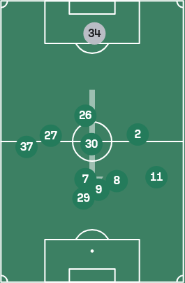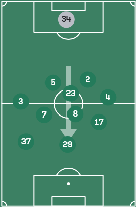 2.后腰回落左中卫,左中卫内收,左边翼卫回撤。塞尔吉尼奥二线回接,阶段性右边前卫摇摆(不多)前推右翼卫