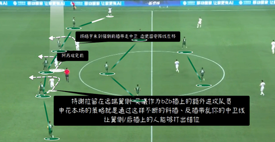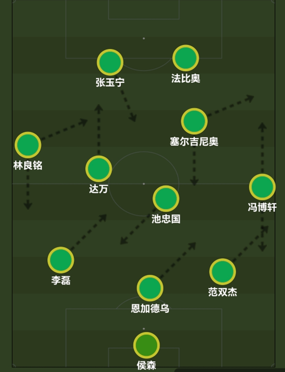 在这场比赛前,国安在进攻组织时阵型维持3142,单后腰在中路承压,左中场前插到二线。本场塞蒂恩最大的变化是池忠国的首发定位终于不是他难以撑起的中轴线了。塞蒂恩尝试了一套三四后卫切换的build up阵型。即池忠国从后腰(原为3412阵型下的右中场,原build up站位中的单后腰)位置上落回中卫线,也就是左中卫的位置,恩加德乌站位右中卫但仍做拖后,将范双杰的位置拉开到右后卫,左边中卫李磊内收进左后腰,而林良铭回撤到左后卫位置。此时,由于李磊补进左路内线,原来的左中场(原为古加左8 本场为达万)仍然进行前插接近二线。那其实不难发现,右路原有的站位会出现线间距离过远的情况,阵型明显是脱节的,因此塞蒂恩让塞尔吉尼奥从二线上回接,即右倾前腰填补到右中场的位置,右路由于范双杰拉开的宽度,得以解放顺足小个边翼卫的进攻高度,让冯博轩的位置推到右路非常靠前的边前卫位置,直接进行弱侧前插,充当半个边锋。这一套新的进攻思路在本场比赛中其实已经呈现得非常清晰了,解放了冯博轩的进攻高度,补充了右半扇的逆足元素,尽可能避免了左中场技术不足掉球的情况,发挥了李磊向前传球的能力。本场甚至出现了我之前提到的一个思路,即少见回合中出现的塞尔吉尼奥逆足侧边前卫作为组织点,让小个围绕跑动的情况,但我更倾向于这部分是自然发生的轮转,而非教练重点强调的进攻路数中的一种。但这套的大逻辑上有两个症结,其一是教练对球员的使用方式,其二是球员本身适配性的问题。