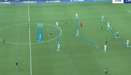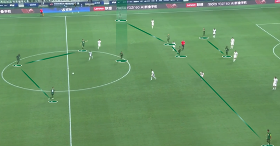 申花如何利用国安身后,国安防守端的大问题说完了,接下来是国安进攻端的问题。在进攻展开时,仍然选择了3142站位,因此,边中卫怎么把球送进阵型里,阵型里该如何跑位、如何利用宽度打出进攻消耗,就是本场比赛的重点。