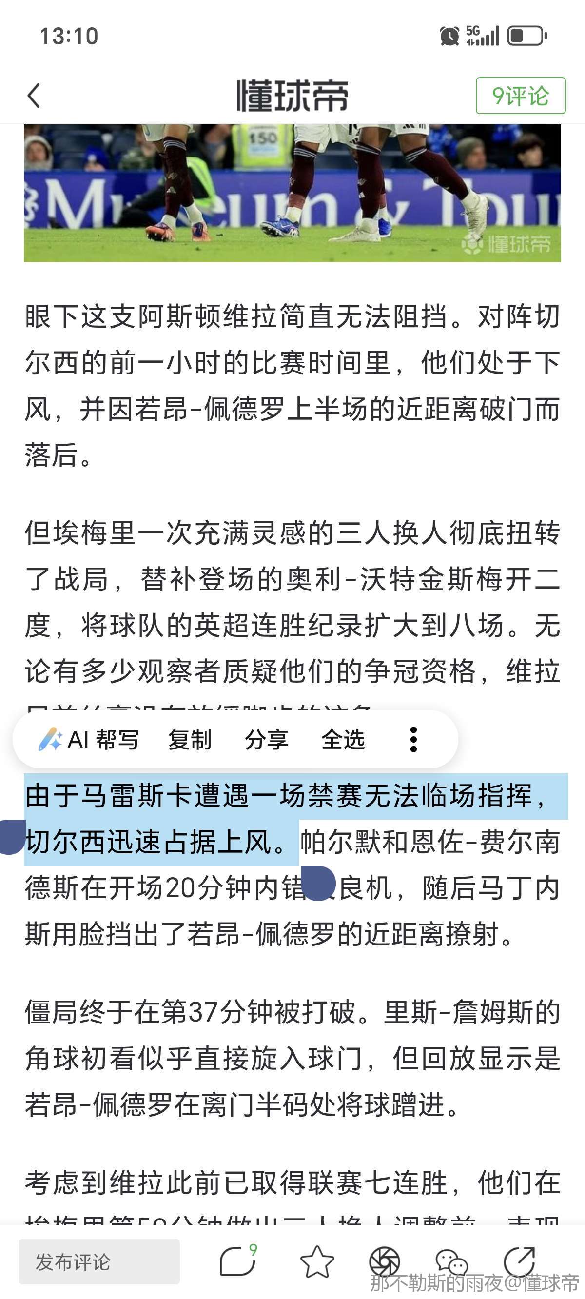 当时裁判组并未认同——但在比赛还剩一分钟时,桑切斯急于让切尔西前压寻求扳平,带球前进时滑倒,惯性使球出了禁区。