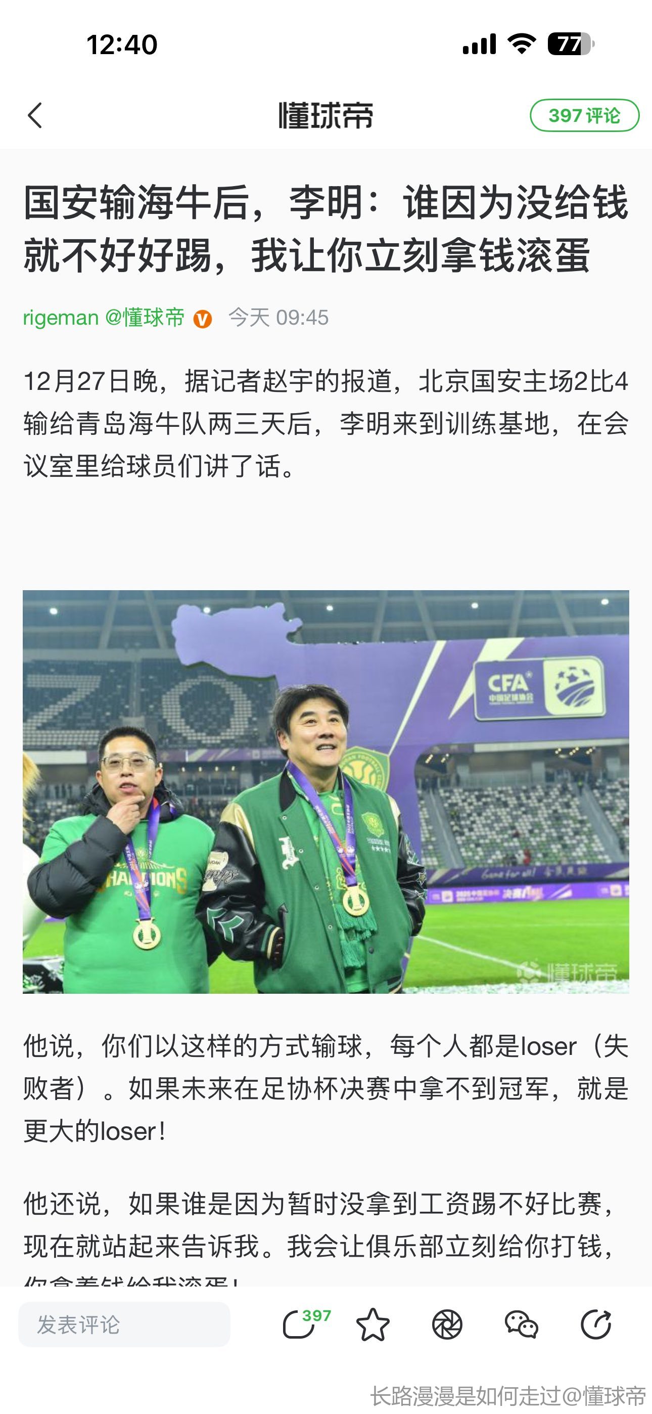与其一再强调奖金是递增的是几百万,不如调查清楚这个奖金是口头承诺还是白纸黑字签字画押的。如果真的只是口头承诺老板不兑付也不影响正常准入,最多就是老板人品有问题。而且这帮人奖金高了就能赢球,写在合同里的奖金一场10万的时候就是冲甲组倒数第一,这种纯纯为钱踢球的老登活该没球踢。