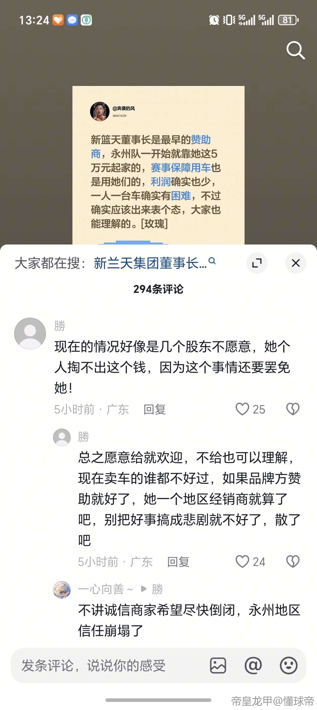 女老板就是不送车,我们永州人都不会忘记她是最早赞助永州队的人。你们先去搞清楚各种缘由再来喷好不好。是永州队主教练在开玩笑的情况下怂恿女老板答应送车的。黄教练自己都觉得永州队不可能夺冠,所以才起哄让女老板答应的,结果最好夺冠了,黄教练自己都不太好意思了。