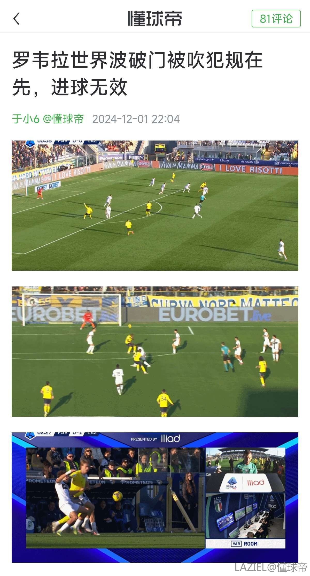 拉齐奥投诉遭遇误判,意甲主席:裁判失误是比赛的一部分