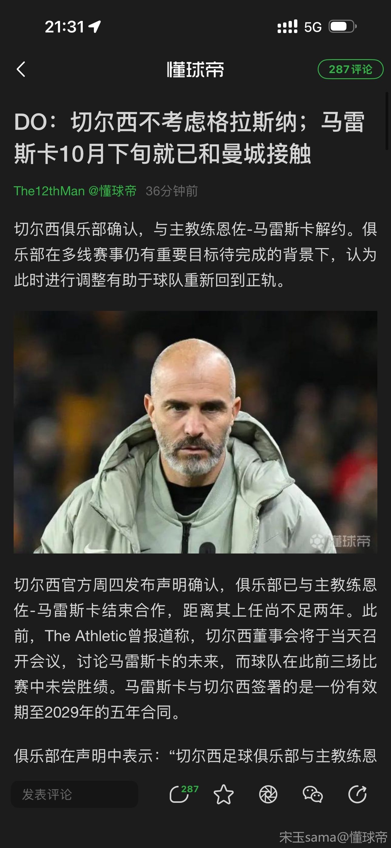在成绩下滑、场上表现走低,以及马雷斯卡个人不满情绪愈发明显的背景下,切尔西内部认为,此时分手或许是对双方都更合适的选择。接下来,俱乐部必须迅速向前,以应对密集赛程和赛季后半段的挑战。