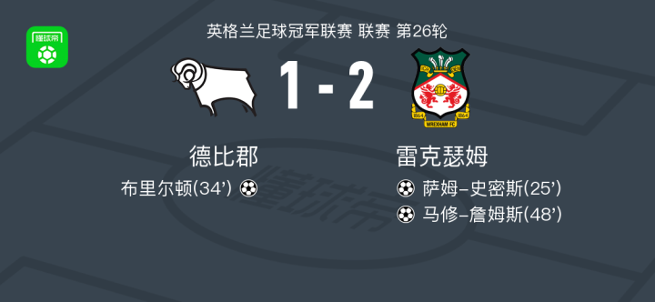 北京时间1月4日英格兰足球冠军联赛 联赛 第26轮,德比郡主场对阵雷克瑟姆。德比郡布里尔顿破门。雷克瑟姆萨姆-史密斯破门,马修-詹姆斯破门。最终比分德比郡 1-2 雷克瑟姆。