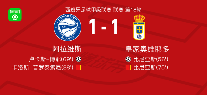 懂球帝首页>动态> 阿拉维斯1-1皇家奥维耶多,比尼亚斯首开记录,卢卡斯-博耶扳平比分