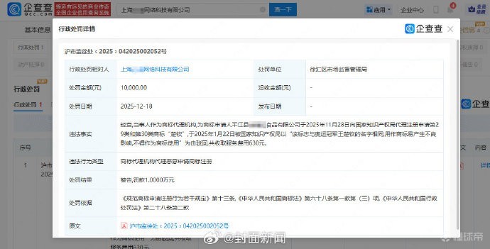 扫描下载懂球帝首页>动态> 商标代理机构因申请“楚钦”商标被警告,并被罚款10000元