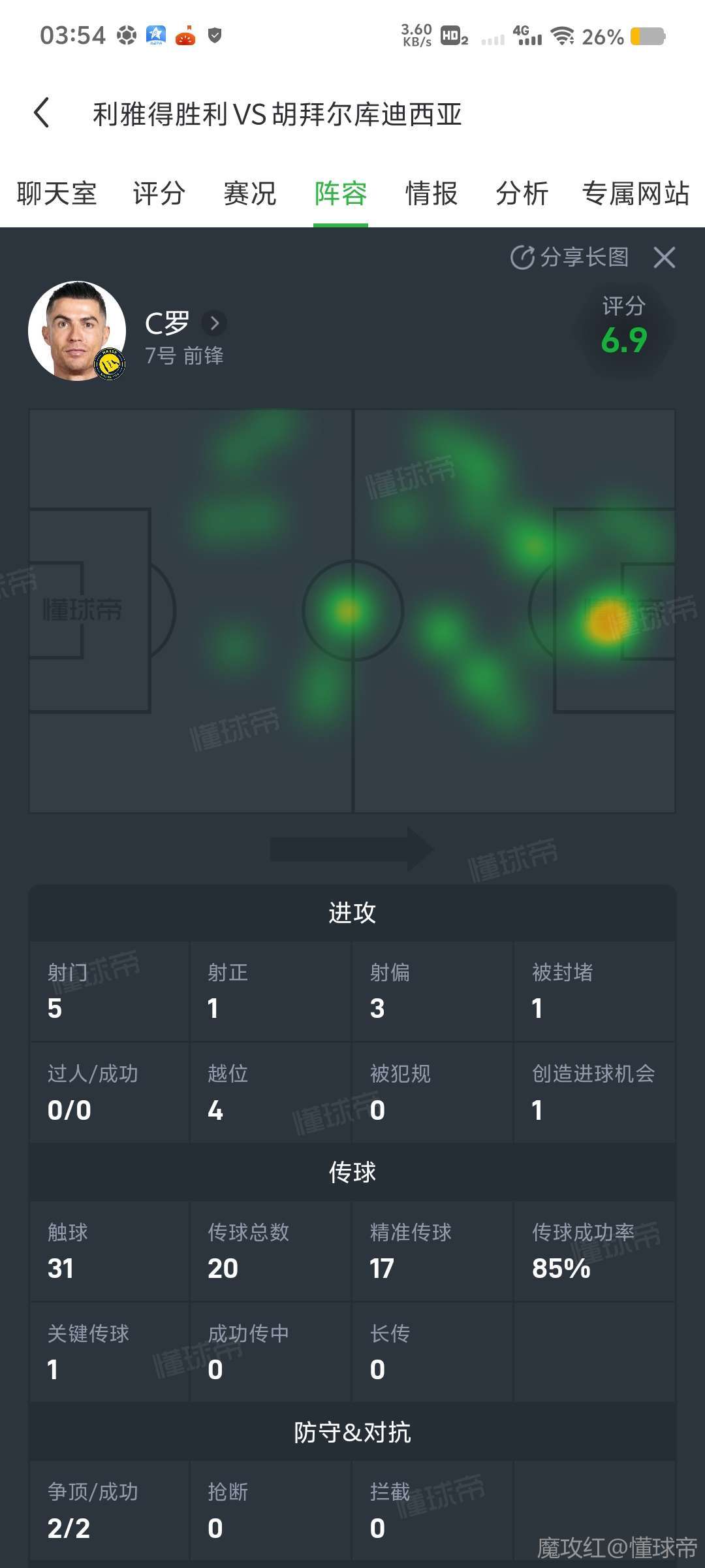 本场比赛C罗个人数据:进球1个(点球),助攻0,射门5脚(1脚射正),过人0次,球失球权8次,越位4次,触球31次,传球19次,传中、长传全是0次,拦截、抢断成功、解围、地面对抗全是0,就连犯规和被犯规也全是0