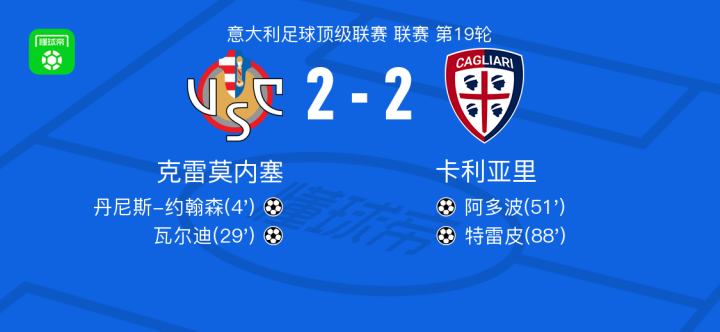 01-09 04:45半场战报:克雷莫内塞2-0卡利亚里,瓦尔迪1传1射,丹尼斯-约翰森建功